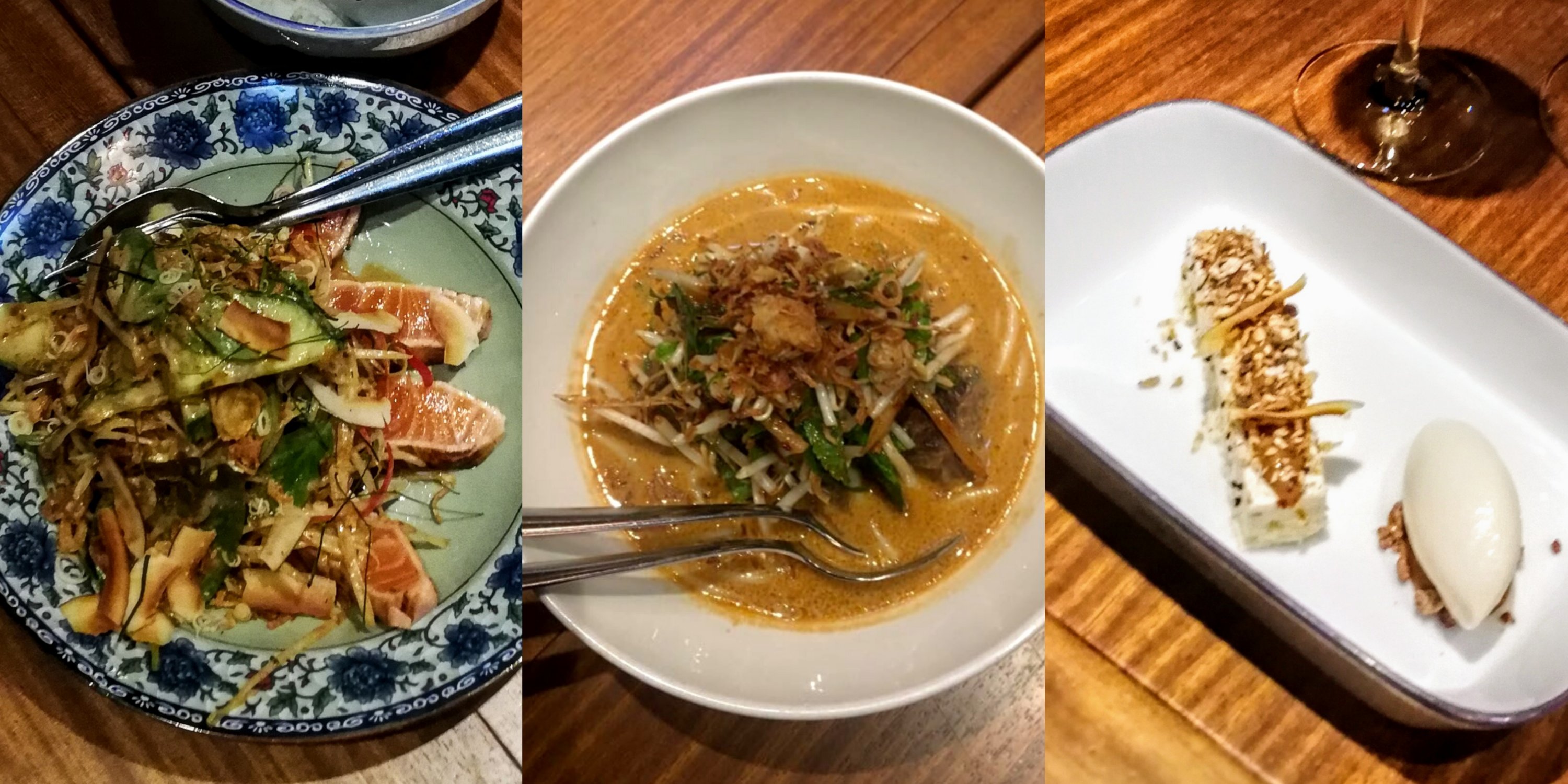 Henkilökunta tuntui aidosti nauttivan työstään ja safka…ah, safka oli taivaallista. Söimme eteläaasialaiseen tyyliin jaettavat annokset, alkuun sashimilohta ja pääruuaksi possunposkea. Jälkkäri, kookosjäätelö tilpehööreineen, on Farangin klassikko. Vegevaihtoehtojakin oli lounaalla hyvin.