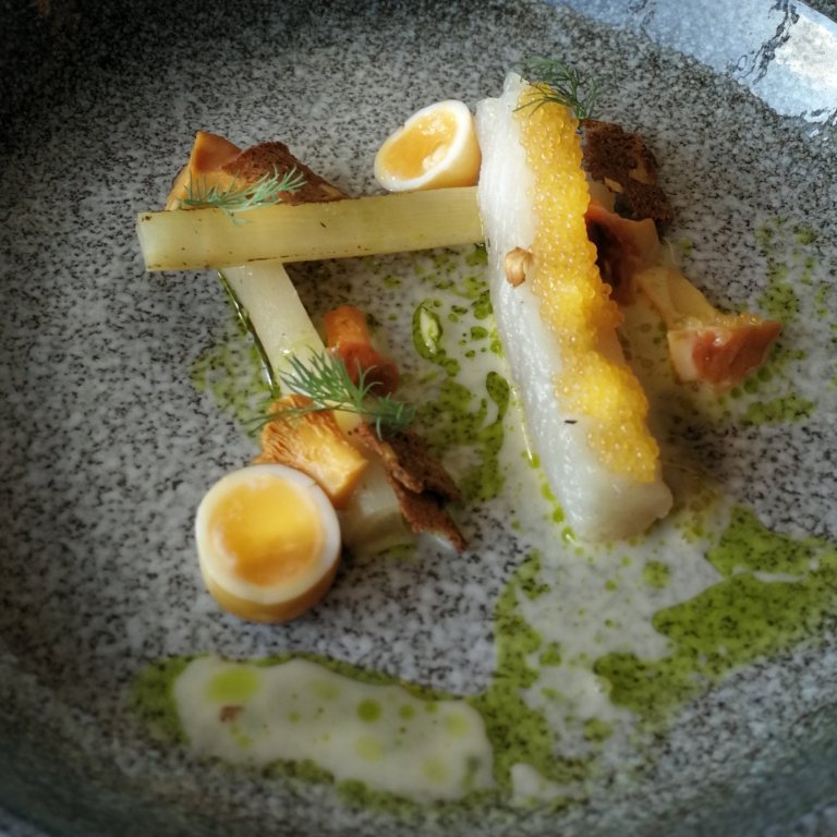 Siika ja mustajuuri. Graavattu siika toimii aina ja siianmäti on yksi mun omista lemppariaineksista. Tilliöljy antaa kalalle hyvän taustan, paahdettu mustajuuri jää tällä kertaa annoksessa kakkoseksi. Pikkelöidyt kantarellit ja keitetyt viiriäisen munat sopii settiin hienosti, vaikka vähemmilläkin komponenteilla ois pärjännyt.