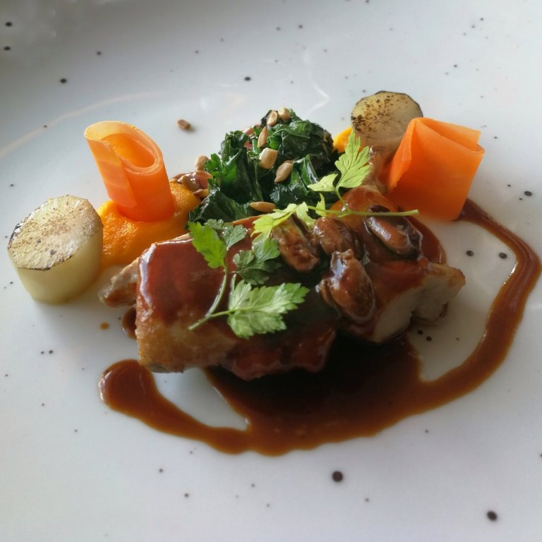 Possu ja punajuuri. Punajuuri on kypsytetty heinässä ja maistuu vienosti savustetulta. Lautasella on myös keltajuurta. 6 kuukautta suolattu possu on hyvä lisä, vaikka valkonen läskireunus jääkin syömättä. Jotenkin odotin lihan olevan pitkään haudutettua. Annos on silti fressi ja ilosennäköinen. Itävaltalainen Pfaffl Weissburgunder-valkkari toimii parina oivasti. Hyvä avaus menuulle.