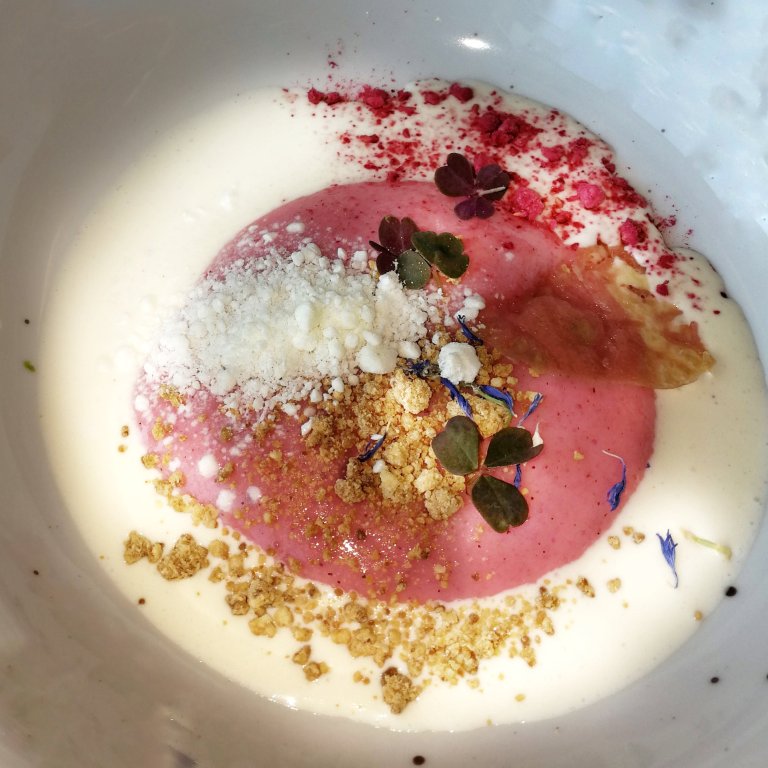 Punaherukkamousse. Jälkkäri tuo maultaan mieleen ihanasti mummolan vispipuuron. Ehkä omaan silmään vähän hassun ja lässähtäneen näkönen annos, mutta helposti lusikoin koko lautasellisen. Semolinasta ja herukoista tehty mousse ja tuoksumataralla maustettu kermamaito on koristeltu rahkalumella. Samoin kuin lapsuuden vispipuuro, ei tämäkään herkku ole liian makea. Piemontelainen spumante kruunaa jälkkärin -ja koko aterian.