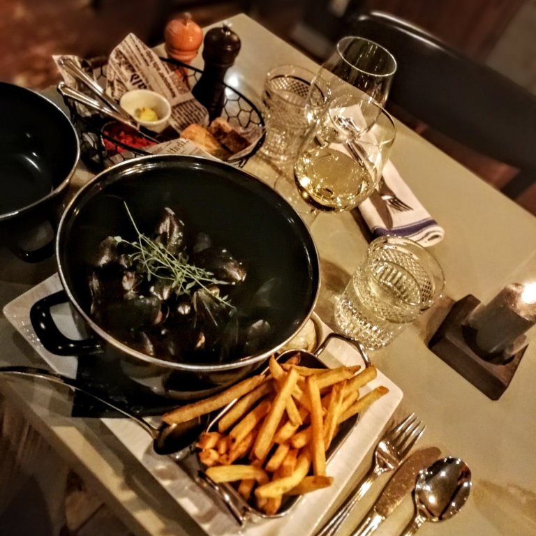 Hotellin yhteydessä on kouvolalaisten lempi-ravintola, bistro Frans & Rose. Sokos Hotellien konseptin mukainen, ranskalaista maalaishenkeä tunnelmoiva rafla on viihtysä. Vaikka asiakkaita oli paljon, ei yksinsyövää ruokailijaa tuupattu nurkkapöytään ja jätetty oman onnen nojaan, vaan tarjoilijat varmisteli muutamaankin otteeseen, että kaikki on hyvin. Ja kyllä oli, nimittäin onnekkaasti sesongin myötä visiitti-illan perjantaina oli tarjolla Mieskin lempiherkkua, sinisimpukoita perinteiseen tapaan ja talon omaan liemeen valmistettuna. Suositeltu riesling sopi annoksen juomaksi oivasti.