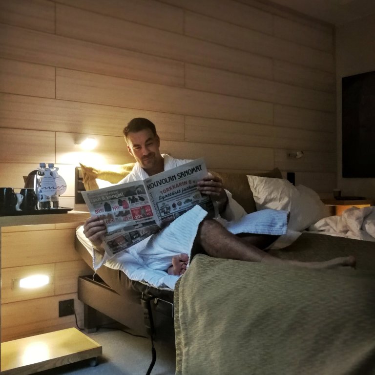 Ite olin juontokeikalla viikonlopun Kouvolassa ja vaikka matka kotiin Helsinkiin ei oo pitkä, ois reissaaminen iltamyöhän ja aamutuiman välissä kuitenkin eestaas ollu ihan älytöntä. Hotellin Superiorx Twin-huone anto mukavaa extraa yöpyjälle. Huoneen motoroiduilla sängyillä saa itelle mielekkäät patjanasennot nukkumiseen ja lököilyyn. Vanhanajan puolapuut ja jumppapallokin löytyy huoneen nurkasta venyttelyjä varten, tosin hotellin kuntosali on myös melkein vieressä. Lisäks hintaan sisältyy mm. kylpytakit ja tossut ja mikä upeinta, oma sauna. Itelle sattu infrapunasaunallinen huone, myös sähkösaunallisia huoneita on. Mikään ei voita tunnetta, kun pitkän työpäivän ja illallisen jälkeen saa nauttia saunan lämmöstä omassa rauhassa ja pujahtaa siitä suoraa yöpuulle.