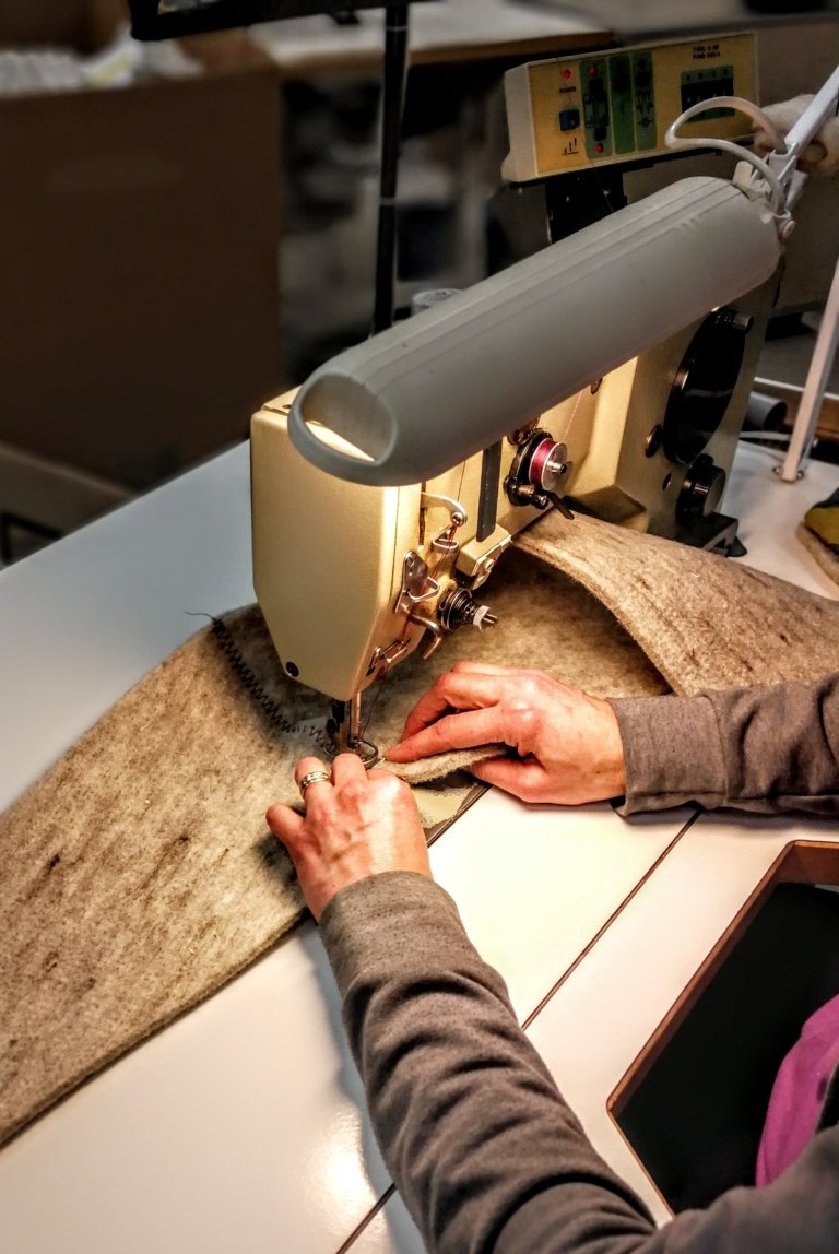 Vaikka koneita siis tehtaalla käytetäänkin, miltään liukuhihnalta ei tossuja kuitenkaan synny. Jokainen tuote kulkee useammankin käsiparin kautta, ennenkuin on valmis myyntiin. Lahtisilla käytetään materiaalina vain puhdasta lampaanvillaa, se sopii huopikkaiden valmistukseen parhaiten. Aluksi aihio on kaksikin kertaa suurempi, kuin lopullinen tuote. Huovuttaja muokkaa koneen avulla huovan juuri sopivaksi, olennaista on saada aikaseksi oikea tiheys ja vahvuus. Huovutuksen jälkeen aihio muovataan lestin päälle kuivumaan ja venytetään haluttuun muotoon. Varsinainen huovutusprosessi perustuu villakuitujen takkuuntumiseen. Valmistustavasta johtuen on hyvä muistaa, että huopikkaat saattaa aavistuksen kutistua käytössä. Tärkeintä kuitenkin on, että jalassa villahuopa on kevyt, lämmin ja ilmava. Niin, ja puhdas lampaanvilla ei juurikaan rasita luontoa.