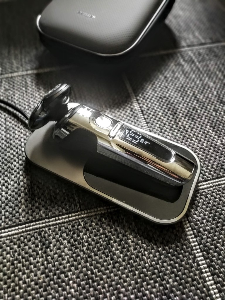 Philips S9000 Prestige näyttää hyvältä. Se on virtaviivanen ja metallinhohto antaa sille entistäkin ylellisemmän ilmeen. Mukana tulee yhtälailla tyylikäs latausasema ja säilytysboksi sekä lisävarusteet. Vaikka laitteen tehokkuus ja toimivuus onkin tärkeimmät kriteerit, ni eihän se haittaakaan tee, että laite on samalla myös stailin näkönen. Ennen ensimmäistä käyttöä kone ladataan. Se asetetaan lepäämään Qi-latausaseman päälle, valoefektit välkähtää ja äänimaailmakin myötäilee koneen olemusta. Prestige latautuu nopeasti: pikalataus 18min ja täysilataus n. 3tuntia. Käyttöaikaa se lupaa tunnin latauduttuaan.