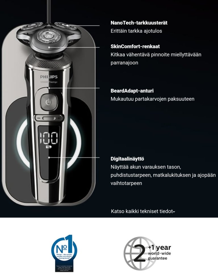Sanotaan, että parta ei pahoille kasva. Varmaan sanonta pitää paikkansa, kun mulla kello viiden sänki on naamassa jo parranajon jälkeisenä päivänä. Trimmaan parran kolmesti viikossa ja joskus harvoin innostun myös ajamaan koko pärstän siloiseksi. Pieni sänki on koristanu leukaperiä vuosikaudet ja tuntuu, että se on jo osa mun identiteettiä. Oon tottunu käyttään höylää naamakarvojen ajoon, mutta nyt sain kokeiltavaksi partakoneiden varsinaisen aatelisen, Philips S9000 Prestigen.