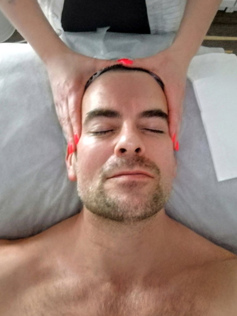 Niinku himassakin, myös hoitaja puhdisti ensin mun kasvot. BTB13 Sensitive Puhdistusvaahto sopii herkällekin iholle, mut hyvin myös tällaselle munkaltaselle paksunahalle. Puhdistamisen jälkeen kasvot kostutettiin Sensitive Tonerilla, jonka sekaan Maria lisäsi pari tippaa C-vitamiinia just kirkastamaan ihoa. BTB13 -sarjassa on useempi eri hoitolinja, joista yksi nimeltään Medical. Tän linjan Peeling Gel -happokuorinta on super. Mä oon ihan varma, että mun ihosta lähti viis vuotta ikää sen mukana. Kuorinta viimeisteltiin taas puhdistusvedellä, jossa edelleen vahvisteena C-vitamiinia. Huvittaa, mut tässä vaiheessa viimeistään alko ramaseen ja taisin hetkeks torkahtaa.