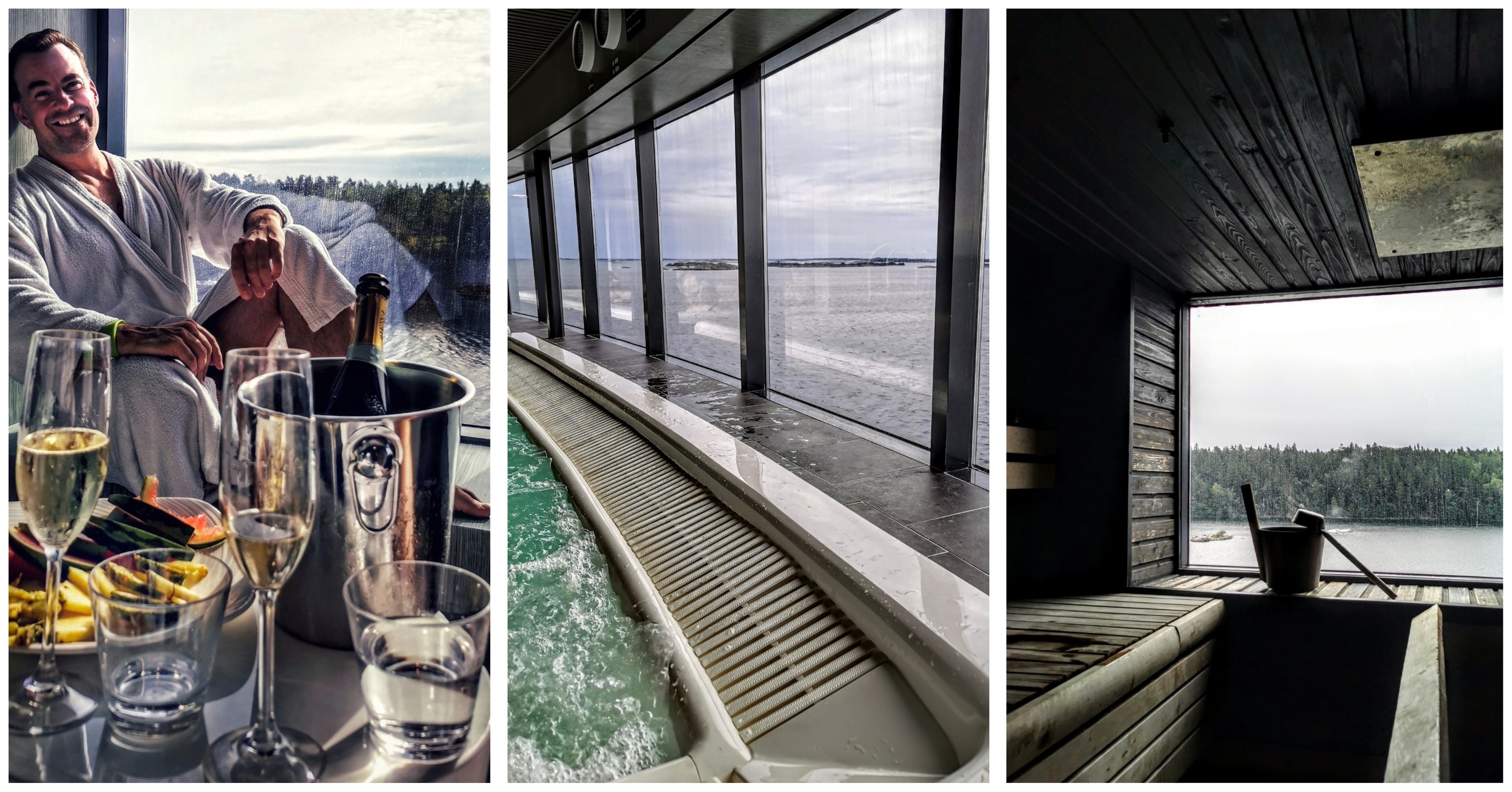 Myös span Babor-hoidot on priimatasoa. Mä kävin about vuos sitten testaamassa Captain’s Choice -kasvohoidon, tälläkertaa oli vuorossa laivan signature-setti, Sail away. Yhdistelmähoito sisältää selän hieronnan ja kuorinnan lisäks syväkosteuttavan kasvohoidon. Hoitajan hierontaotteet oli omaan makuun just sopivan voimakkaat ja naama oli kumppaninkin mielestä poikkeuksellisen helee kasvohoidon jälkeen. Miesasiakkaiden määrä on hoitolassa jatkuvassa kasvussa, mikä on tosi hienoo! Spahoitojen hintaan sisältyy myös sisäänpääsy kylpylän puolelle. Isommalle jengille suosittelen Gracen VIP-saunaa, jonka voi vuokrata jopa 8:lle. Oman saunan lisäks tilassa on poreallas ja isomman Grace-saunan hintaan kuuluu myös pullo kuplivaa. Vip-saunojat saa nauttii toki kylpylän muistaki löylyistä ja poreista.