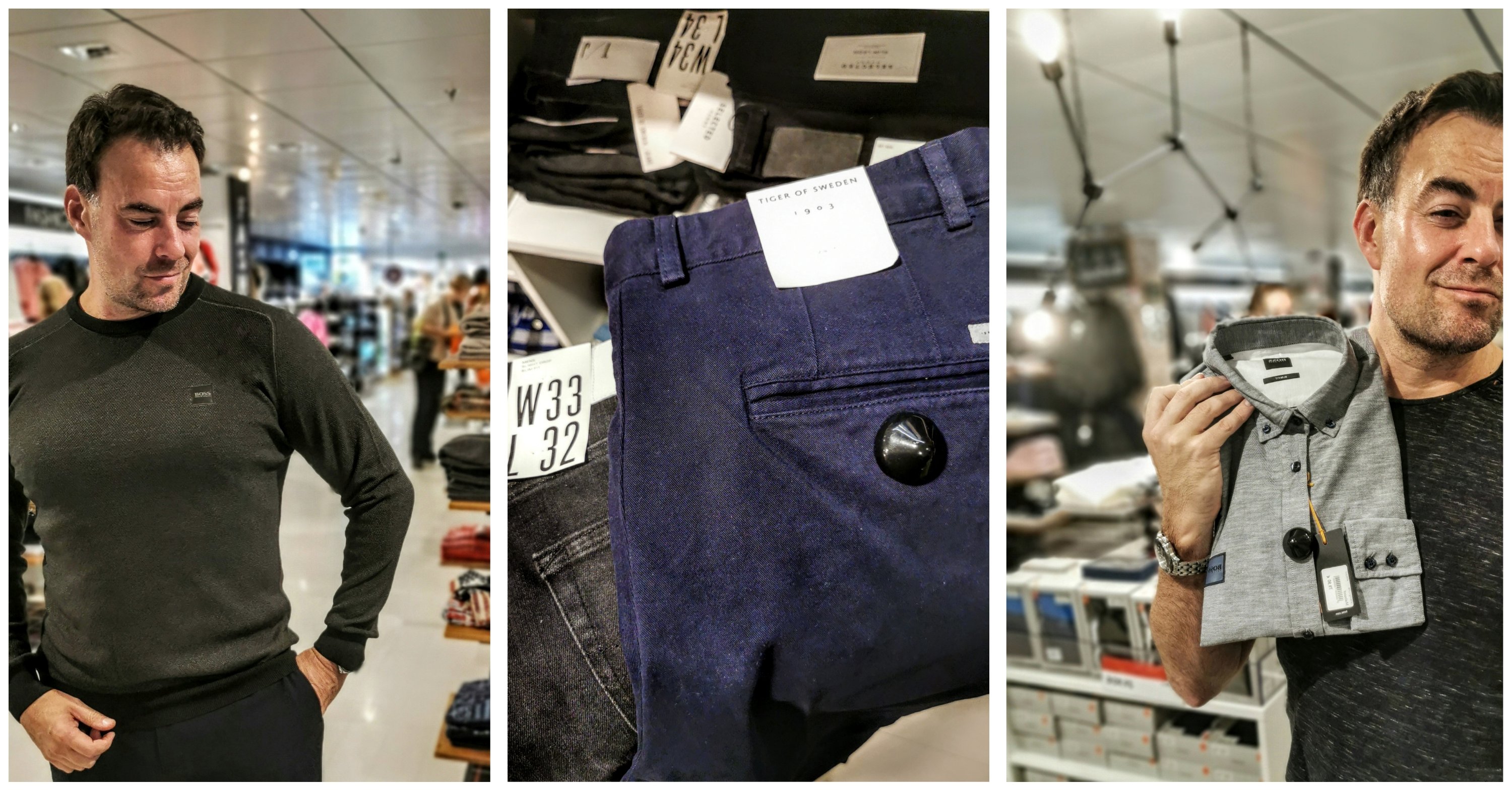 Viking Gracella muotiin on panostettu ja tax-freen vaate-tarjonnassa luotetaan tunnettuihin laatumerkkeihin. Vaik valikoima on rajallisen tilan vuoks kompakti, löytyy miehille paljon juttuja rennoista huppareista liikemiehen kriteerit täyttäviin paitoihin ja asusteisiin. Omii lemppareitakin löyty ja sopivien kokojen jne. löytämisessä jeesas valpas henkilökunta. Kotimaisen BilleBeinon pirteet kollarit on hyvä esimerkki siitä, et mieskin voi pukee päälleen muutaki ku mustaa, harmaata tai ruskeeta. On hienoo, et reippaita värejä löytyy myös miesten vaatetarjonnasta ja on toki samalla kiva suosii suomalaista suunnittelua. Kukin taplaa kuitenki tyylillään ja hillitympääkin settiä on täälläki tarjolla. Gracen housuvalikoimasta ainaki Tiger of Sweden farkut istuu itelle hyvin ja mustissakin väri säilyy pesusta toiseen. Ne voi yhdistää vaik Bossin paitoihin. Käytän todella harvoin ite kauluspaitoja, mut nää rennonstailit paitamallit taipuu hyvin myös relampaan lookkiin. Ja maltillisen sävyset paidat on turvallinen valinta ja hyvä hankinta -ne kun sopii moneen tilanteeseen. Rohkenin yllättäen kokeileen myyjän ehotuksesta myös klassista tikkitakkia, joka aiemmin olis jääny rekkiin ilman mitään huomioo. Ja oho, se näyttiki päällä hyvältä, vai mitä? Oon jostain syystä totuttu pitään Barbourin vaatteita varttuneempien brändinä, mut kyllähä se oli ihan mallikas. Ja sopis just syksyyn, ku ulkona on lämmin ja vilakka samaan aikaan. Takki jäi kuitenki hankkimatta täl kertaa.
