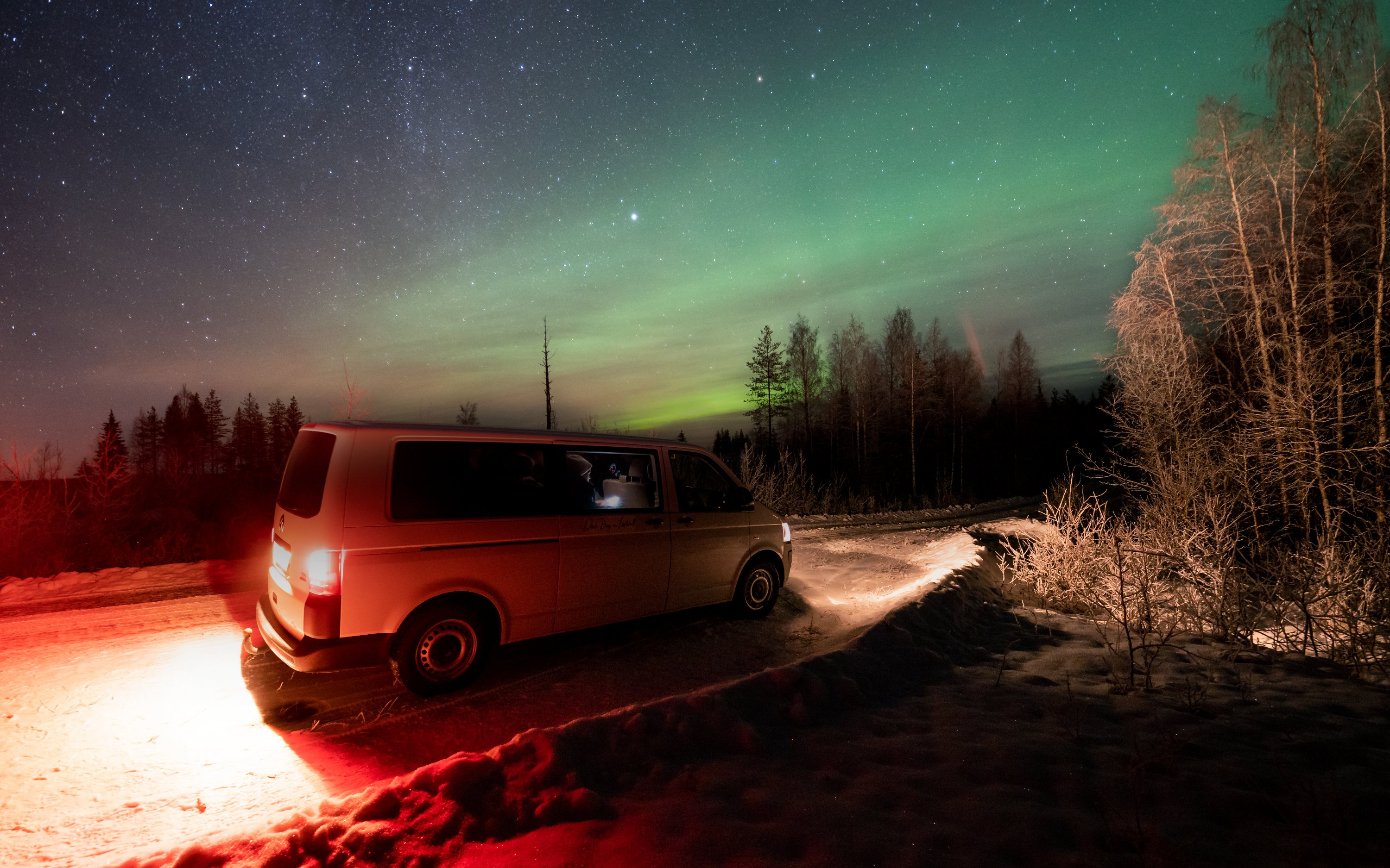 Näistä kahesta Rovaniemi kai tunnetaan parhaiten. Vaik kaamos kestääki monta kuukautta, ei Rovaniemellä pimeessä tartte kulkee. Valo nimittäin on yks tärkee elementti Napapiirin talvessa ja valosuus löytyy myös aidosti paikallisten luonteessa. Toisaalta kaamos ja tuurilla pari tuntii päivässä nähtävä auringon pilkahdus kiehtoo ja kummastuttaa, mut kylhän se varsinainen valoasia on revontulet. Se onkin ilmiö, joka on saanu joulupukin lisäks matkailijat mestoille maapallon joka kolkalta. Revontulia voi toki näkyy Etelä-Suomessaki, mut täällä ehkä todennäkösemmin -keskimäärin jopa 200 kertaa vuodessa. Me päästiin revontulten metsästykseen ammattilaisen kyydissä ja tunteja kestävä safari palkittiin puoliltaöin. On ehkä hyvä huomauttaa, et revontulien bongaamiseen kandee varata oikeesti useempi tunti. Eli jos sulle luvataan tasan kolmen vartin mittanen alkuillan ajelu, ni harkitse kandeeko. Nippelitietona viel, et monissa netissä löytyvissä revontulikuvissahan taivas leimuu punasena ja sinisenä. Todellisuudessa yleisin revontulen väri on vihree ja muita sävyjä havaitaan todella harvoin. Tää vaan, ettet heti odota sateenkaaren kaikkia sävyjä taivaantäydeltä. Ja kun pakkasyössä saatetaan jöpötellä tovi, kandee varusteet olla kondiksessa. Ite vuokrasin Glass Resortilta toppahaalarin bongausretkelle ja se tulikin tarpeeseen.