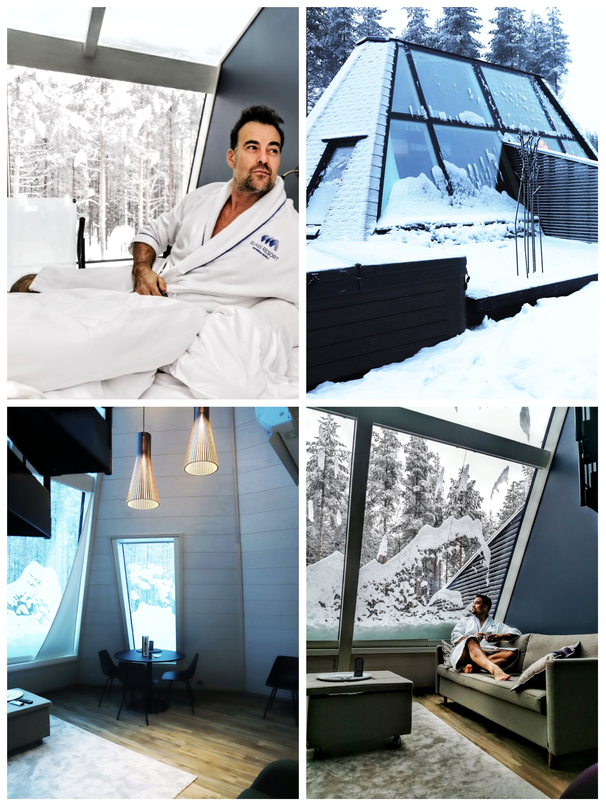GLASS RESORT sijaitsee vajaan 10 kilsan päässä keskustasta, Joulupukin pajan läheisyydessä. Se koostuu 24 yksittäisestä huoneistosta, joiden seinistä suurin osa on paikan nimen mukasesti ikkunapintaa. Paritalonpuolikkaaseen majottuu hyvin vaikka perhe. Alakerrassa on olkkari vuodesohvineen, ruokapöytä, kompakti mut hyvin varusteltu keittiö sekä pesu- ja saunatilat. Yläkerrassa on sängyt kahdelle. Herkullisena yksityiskohtana Glass Resortin jokaisen huoneiston takapihalla on niinikään muiden katseilta suojattu jacuzzi. Mietin, et kun tähtitaivaan alla ja lämpösessä porekylvyssä lepoilu oli tällaselle lumeen ja pakkaseen jo tottuneellekki huikee elämys, ni mitä se mahtaa olla kaukomailta saapuville. Wau-faktori todellakin! Jos jotain huoneistolta sais toivoo, ni ehkä leveemmät patjat yläkerran makuutilaan. Muutoin kokonaisuus hipo täyttä kymppiä! Vastaanottorakennuksessa on lisäks lappilaisia makuja tarjoileva rafla, jossa nautitaan aamusin maittava ja mutkaton brekkari. Glass Resortin vieressä on myös jääravintola ja lumiukkomaa, jotka tosin oli vasta lumetusvaiheessa meidän visiitin aikana. Periaatteessa paikka tarjoo elämysmatkaajalle kaiken tarvittavan.