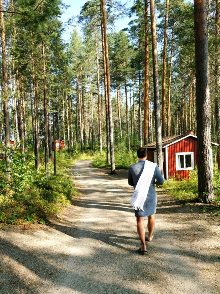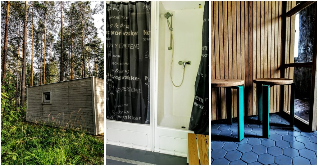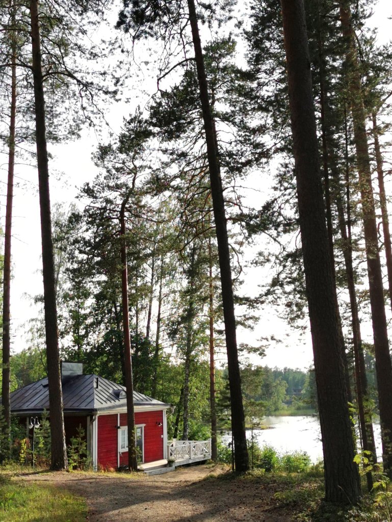 Hyvä vaihtoehto majotuksena kesäaikaan on myös luonnonhelmassa nököttävät, sympaattiset metsähuoneet, jollasessa me yövyttiin. Nää metsähuoneet, oikeesti suloset punaset pikkumökit, on hinnaltaan hotellin huoneita vähän edukkaampia. Varmaan siks, et niistä uupuu juokseva vesi, veski ja suihku. Toisaalta se niissä meitä ainaki just viehättiki. Ja se, et ne tosiaan on sijotettu kävelymatkan päähän päätalolta, omaan rauhaan, järven tuntumaan. Metsänsiimeksessä nököttää vanhanajan puucee ja konttiin rakennettu, kätevä yhteinen suihkutila. Aamulla voi käydä pesulla myös saunalla.