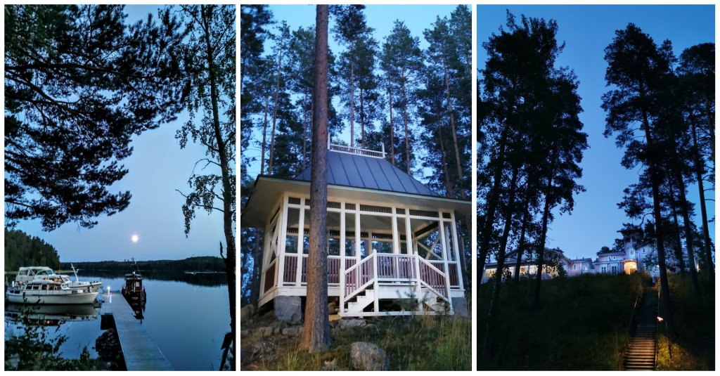 Ite oon vieraillu hotellilla kyl aiemminkin, mut yövyin ekan kerran siel vast viime kesänä. Mietin sillon siinä järvimaisemien avautuessa ikkunoista auton molemmin puolin, et miten voi luonto itessään olla näin nättiä ja miten ihanaa, et meil on tällasia paikkoja. Ja kun vaaleenpunanen talo alko pilkottaan puitten takaa mäen päällä, oikeen ääneen ihmettelin, miks ihmeessä me ei oltu aikasemmin yövytty tääl.