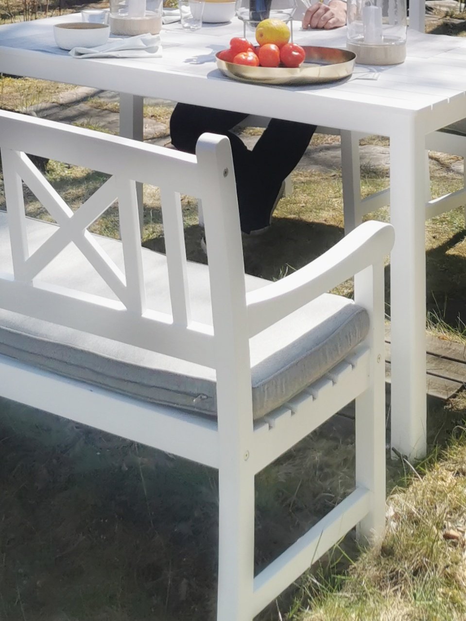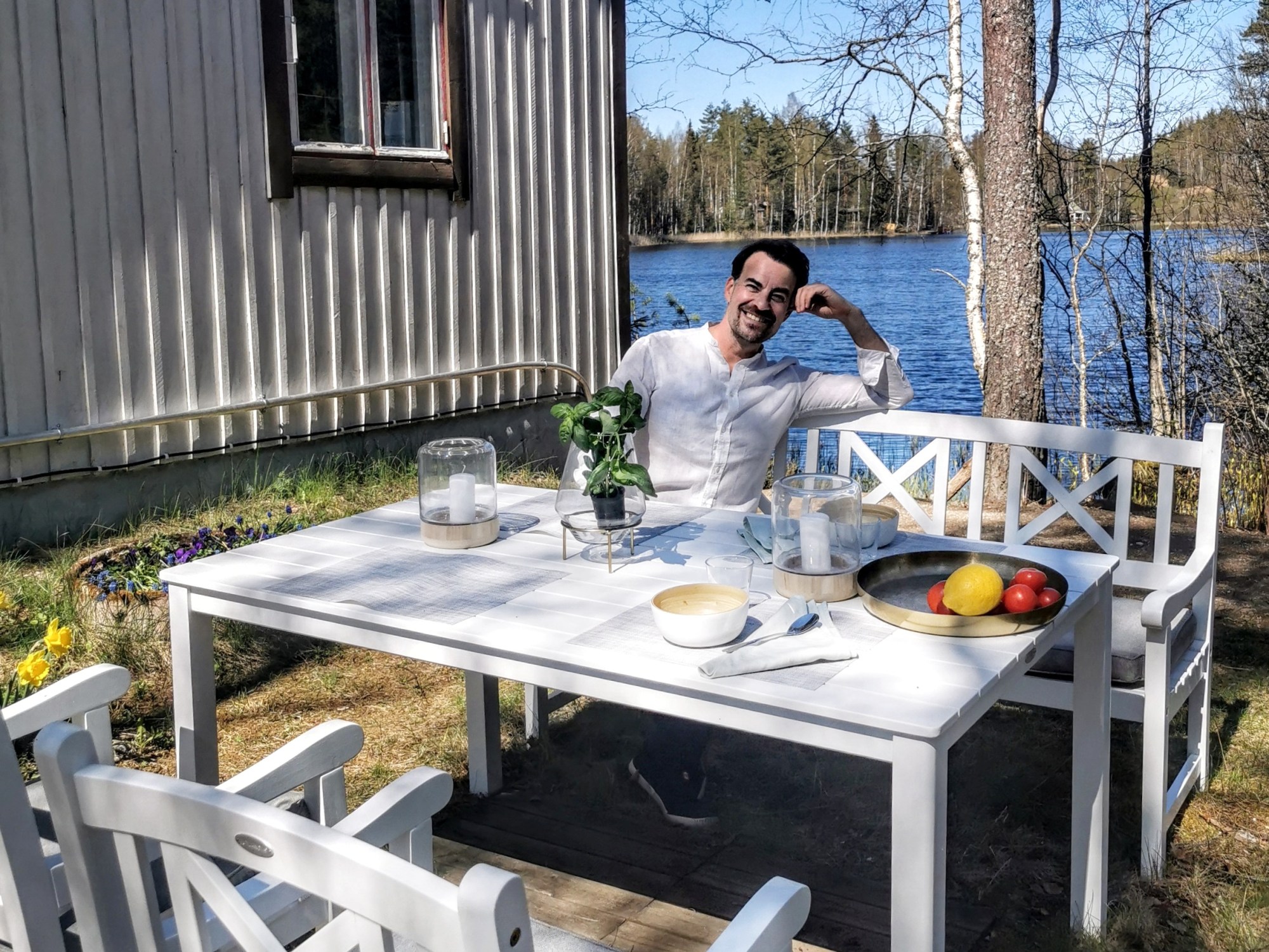 Kovapuiset ja valkoset Hvide Sande -puutarhakalusteet on just sitä, mitä me haettiin. Ne henkii ehkä pikkasen jonkinlaista kartanotunnelmaa, mut silti istuu meidän 50-luvulla rakennetun, sulosen mökin edustalle loistavasti. Pöytäryhmän paikka tosiaan asettu etupihalle ja se on melkeenpä eka asia, mitä pihaan saapuessa näkee. Spotti on sikskin hyvä, et siitä aukee molemmin puolin pöytää näkymät järvelle. Lisäks aurinko kiertää aluetta puiden lävitse lähes koko päivän.