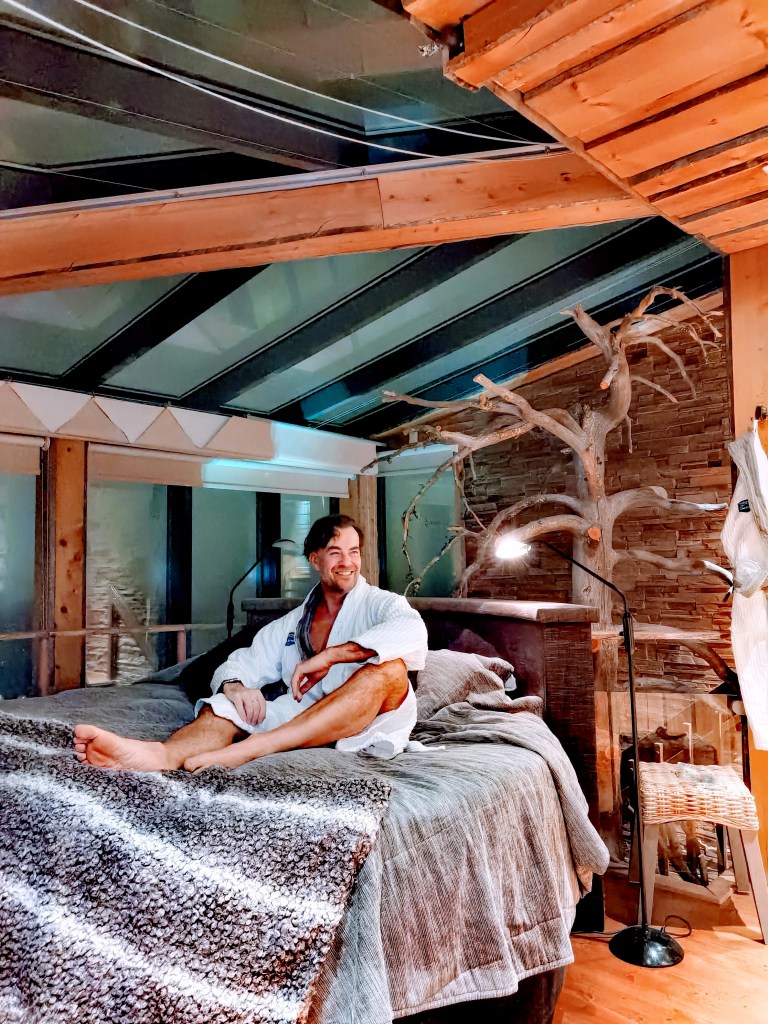 Myös sviitit on tottakai priimaa ja niissä viihtyis mieluusti pidempäänkin. Aurora-sviiteissä on parvekkeet ja poreallas. Moni satsaakin lomalla astetta parempaan. Ite majoituin hotellin todelliseen helmeen, kakskerroksiseen Kotkanpesä-sviittiin. Mikä elämys! Sviittiin on oma sisäänkäynti hotellin ulkopuolelta eli periaatteessa rinteeseen ja muualle pääsee kulkematta vastaanoton kautta. Alakerrassa on sauna suihkuineen, lounge sohvaryhmillä ja takalla sekä kuivauskaappi. Yläkerrassa on huikee näköalasänky, parveke ja sisäporeamme. Koko tilaa hallisee melkeenpä dramaattisen näkönen kelohonkapuu, joka nousee ekan kerroksen lattiasta tokan kerroksen kattoon. Se kuvastaa varmaankin juurikin kotkan pesäpuuta. Aika moista. Sviitti on loistovalinta romanttiselle ajanvietolle tai muuten vaan kaikille, jotka kaipaa sitä extraa elämään -tai ainakin lomakokemuksiinsa.