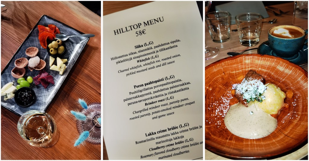 Ravintola Hilltop on tunturihotellin yhteydessä ja nimen omaan uudisrakennuksen puolella. Se tarjoo aamiaisen lisäksi illallista. Jykevät hirsirakenteet ja katosta lattiaan maiseman avaavat ikkunat antaa tilaan keskieurooppalaisen fiiliksen. Jättimäinen, muurattu avotakka lämmittää ja luo tunnelmaa entisestään sohvaryhmien vieressä. Ihan, ku Alpeilla oltas. Omaa silmää viehätti poronsarvin koristellut tilanjakajat.
