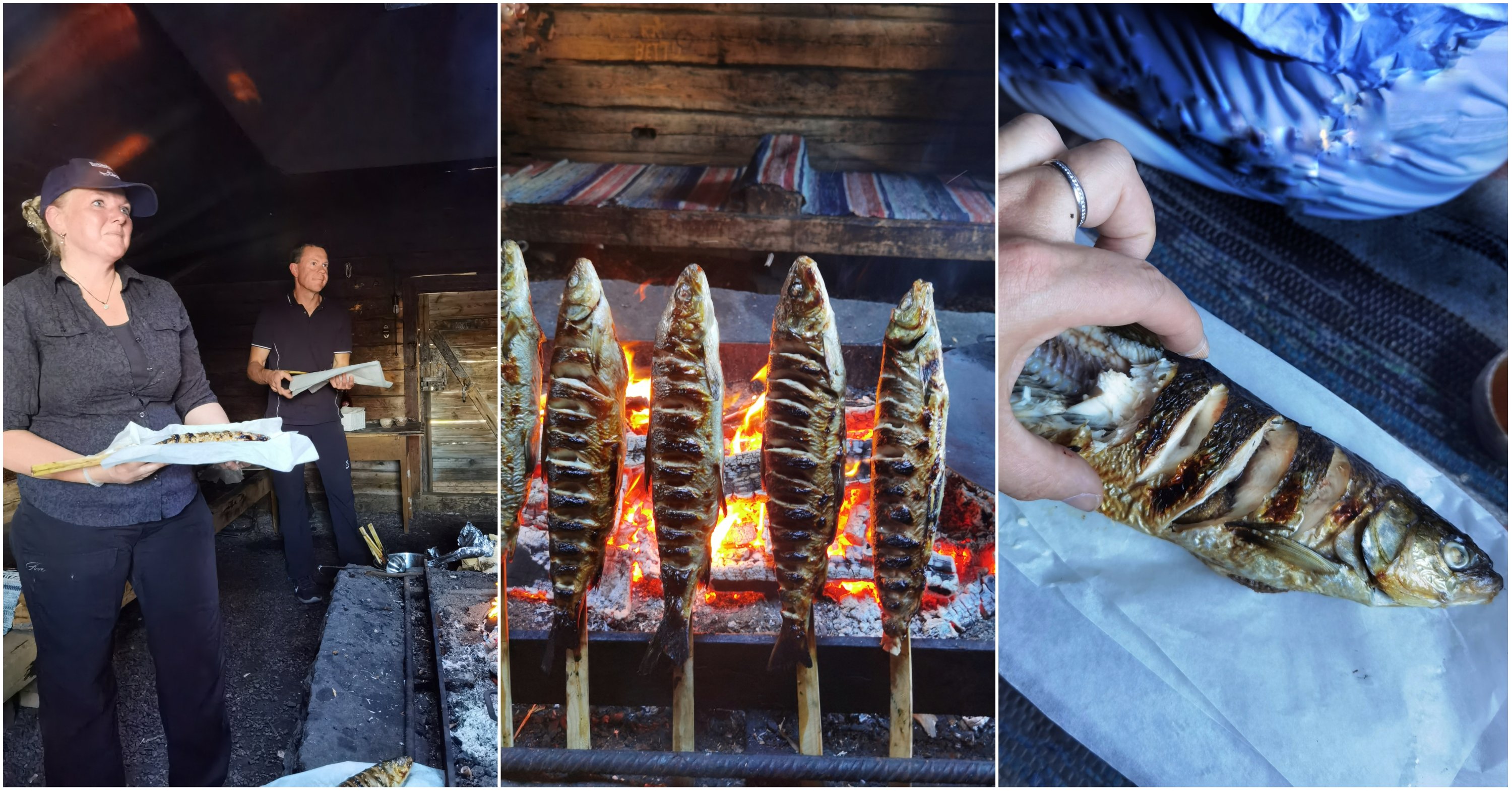 Lauttaretken jälkeen me päästiin Haaparannan puolella lripomaan kodassa leipälättysiä ja nauttimaan, aijaijai, tuoretta ja vastalipottua, nuotionloimussa valmistettua siikaa. Sitä Kukkolankoskella erityisesti nouseekin, lohen ja mateen lisäks. Myös kokki Gordon Ramsay kävi ohjelmassaan juurikin täällä samasella paikalla kalastusreissussa ja nautti meidän lailla samaa, paikallista herkkua tikun päästä.