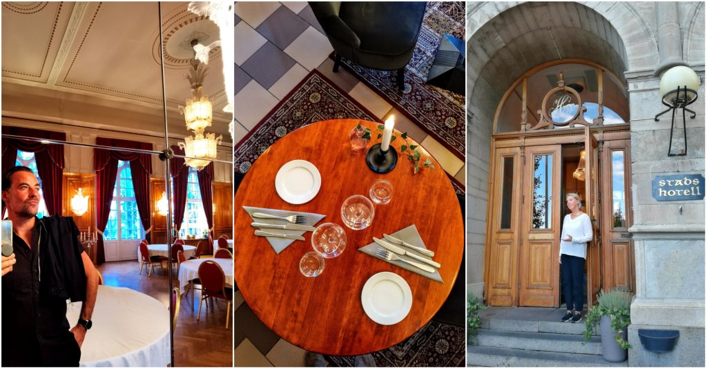 Rajan toisella puolella oleva Stadshotell-kaupunginhotelli on kuninkaallisen kotoisa. Mukavat ja melko kompaktit huoneet on sisustettu lämmöllä ja sellaseen vois hyvin käpertyä muutamaksikin yöksi. Hotellin yleiset tilat, lounge, baari ja aamiaishuone on tosi hienostuneet, Kafé Gulasch Baronen-ravintola ja erityisesti hotellin juhlasali todella prameet. Juhlasalia vois verrata meillä hotelli Kämpin peilisaliin.