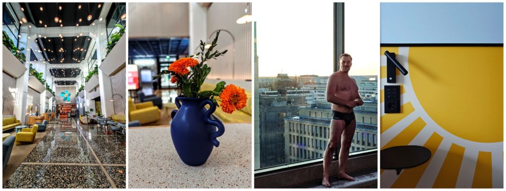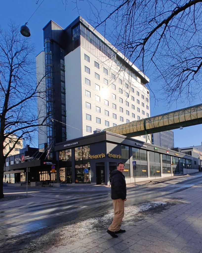 Vartti ennen kuin juna saapui Vaasan asemalle, katosi pilvet taivaalta ja aurinko alkoi paistamaan. Hymyilytti ja mietin, pitääkö sanonta oikeasti näin selvästi paikkansa. Piti tai ei, aloitettiin viikonloppuvierailumme auringonpaisteessa Vaasassa ja keväällä mittavan remontin ja uudistuksen jälkeen avatussa Royal Vaasassa. Tämä 80-luvulla rakennettu, 11. kerroksinen hotelli oli aikanaan Vaasan korkein talo ja edelleen se on monelle yksi keskustan maamerkeistä. Päivitystä tarvittiinkin ja vanhasta rakennuksesta tallella saneerauksen jälkeen on lähinnä ulkoseinät.