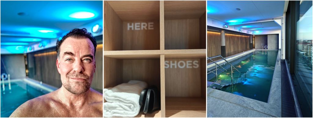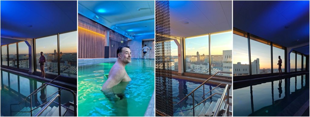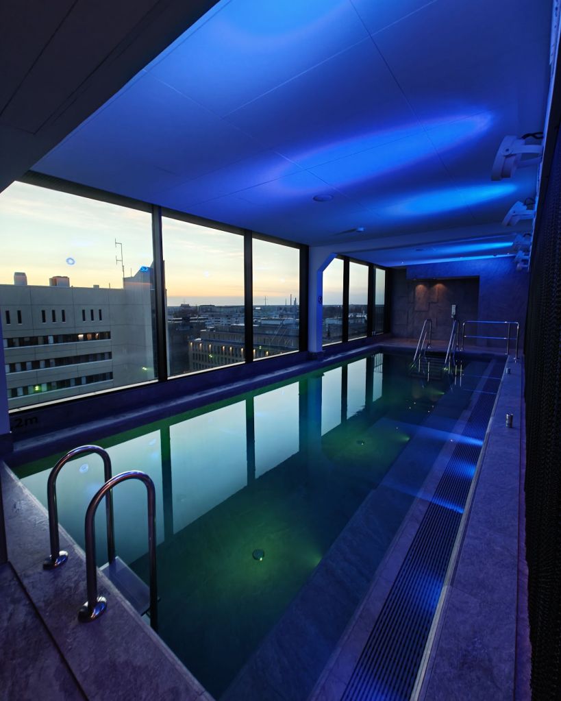 Ai että miten hieno se on! Näkymät avautuvat allasalueelta yli Vaasan kattojen. Myös löylyhuoneen lauteilta pystyy ihastelemaan suuresta ikkunasta kauas kantavaa maisemaa. Pukeutumistilan vieressä oleva lounge on viihtyisä ja siitä käynti parvekkeelle antaa mahdollisuuden vilvoitteluun. Kyllä kelpasi uida aurinkoenergialla lämpenevän allasosaston poolilla ilta-auringon säteiden alla. Kaipaako hotellin saunalta muuta, ei todellakaan! Sauna ja uima-allas on hotellin vieraiden käytössä joka ilta klo 18-22:00 ja viikonloppuisin pääsee nauttimaan myös aamulöylyistä. Huipulla on myös vuokrattavana isompi tilaussauna jopa 30lle henkilölle.