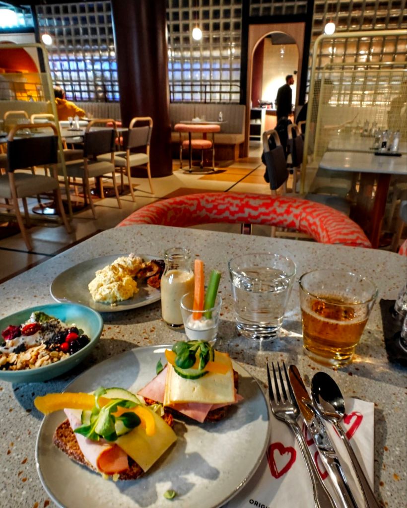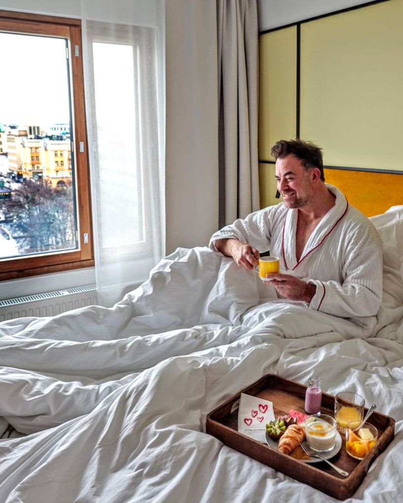 Yleensä tykkään aina syöda aamiaisen muiden kanssa. Silloin saa lautaselleen juuri sitä ja sen verran, mitä itse haluaa. Tällä kertaa kuitenkin toisena aamuna tilattiin aamiainen huoneeseen ja jestas, miten upea kokonaisuus se olikin! Munakasta, kroisantteja, tuorepuuroa, suolaisia ja makeita herkkuja hedelmiä unohtamatta. Aamiainen oli vielä koottu niin kauniisti, että tuli olo kuin olis jotain suurempaakin juhlittu. Kannattaa siis joskus panostaa huonepalvelun kokoamaan aamiaiseen!