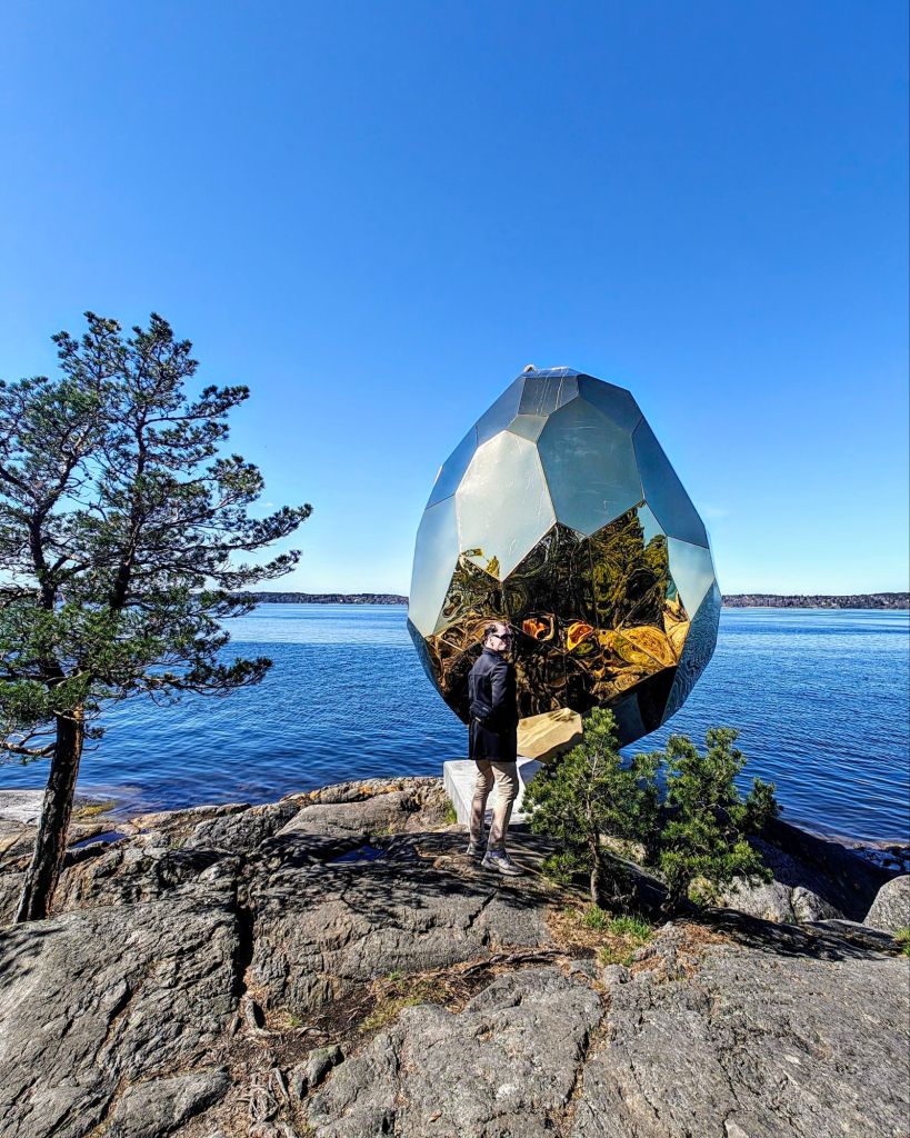 Sisältä jyhkeä, mutta ulkoa katsottuna ympäristöön sulavasti asettuva rakennus oli kaikin puolin käynnin arvoinen kokemus. Vauvanturvaistuimilla omaisuutensa tehnyt Björn Jakobson on hyvän bisnesvainun lisäksi onneksi myös suuri luonnon ja taiteen ystävä. Sen huomaa, kun kulkee alueelle tehtyjä luontopolkuja ja ihastelee (tai ihmettelee) veistoksia niiden varrella. Yksi näyttävimmistä on huikea Bigert & Bergströmin Solar Egg, kullanhohtoinen muna, joka itseasiassa kätkee sisälleen saunan. Joskus haluan kyllä testata sen löylyt ja ainutlaatuisen tunnelman.