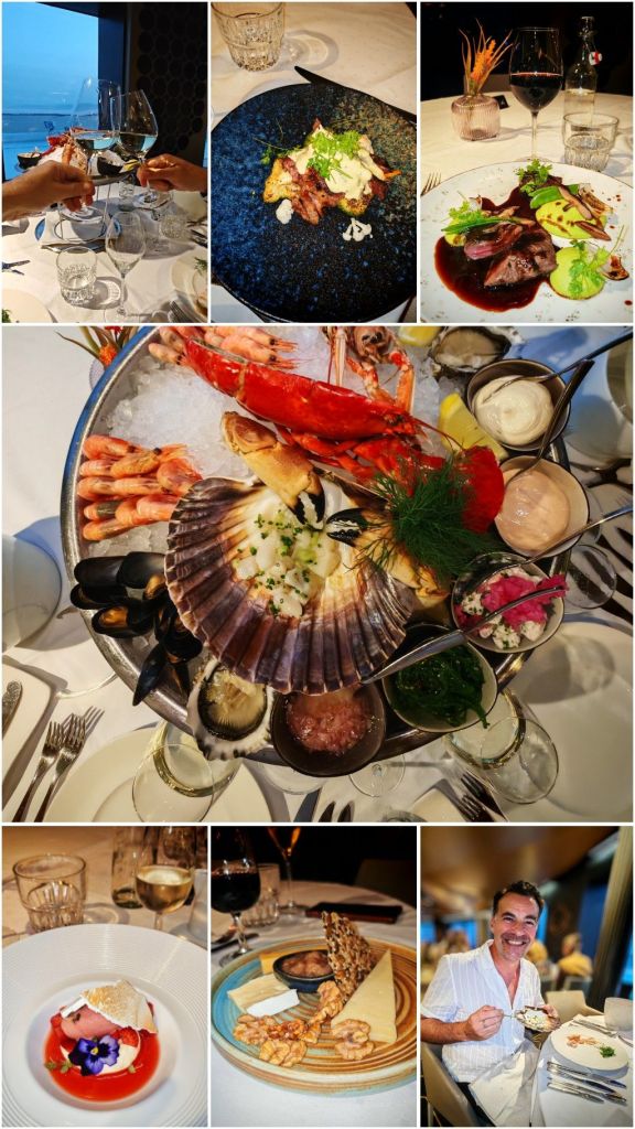 Illallinen me herkuteltiin Oscar à la Cartessa. Aina kun vain on mahdollisuus, me tilataan laivalla äyriäisvati. Niin nytkin, mutta tällä kertaa jaettiin alkupalaksi yhden hengen platteri, kun molemmilla oli mieli kokeilla myös joku liha-annoksista. Pääruokina syötiinkin karitsaa ja illan erikoisuutta listan ulkopuolelta, iberico-possua. Jälkkäriksi vielä kotimaisia juustoja ja raikasta sorbettia.